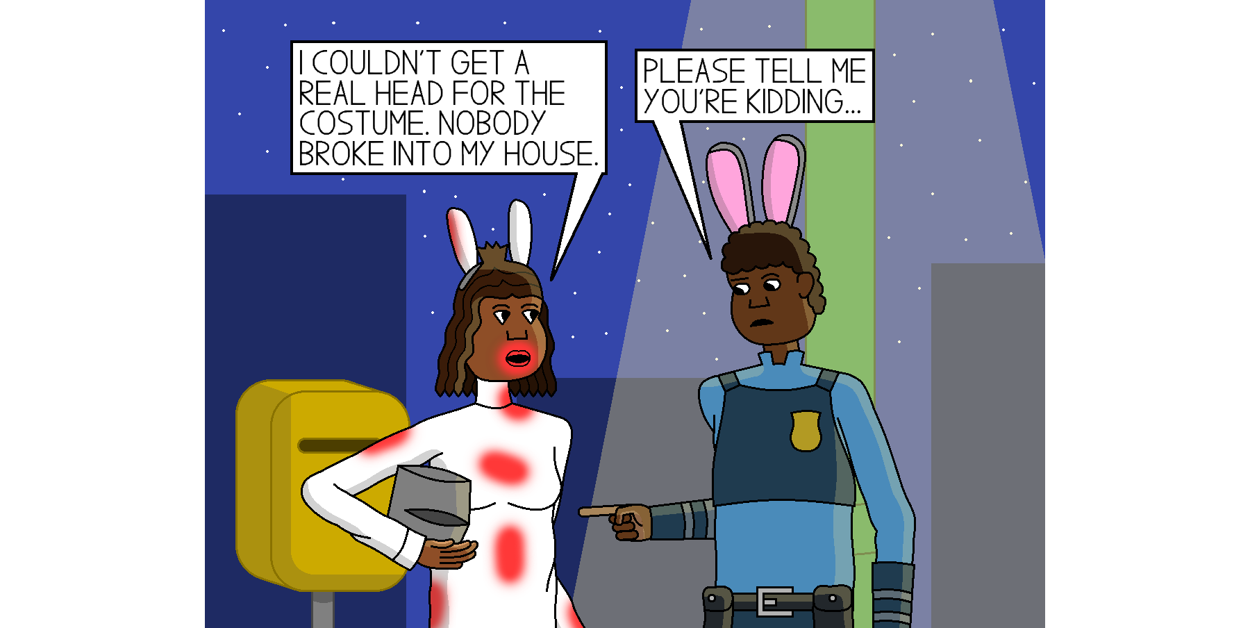 I wanted to put as many of my characters in costumes as I can, so here’s a quick little something before October is over. Anne and Bobby didn’t plan to both dress as rabbits, but that’s just how it goes sometimes.