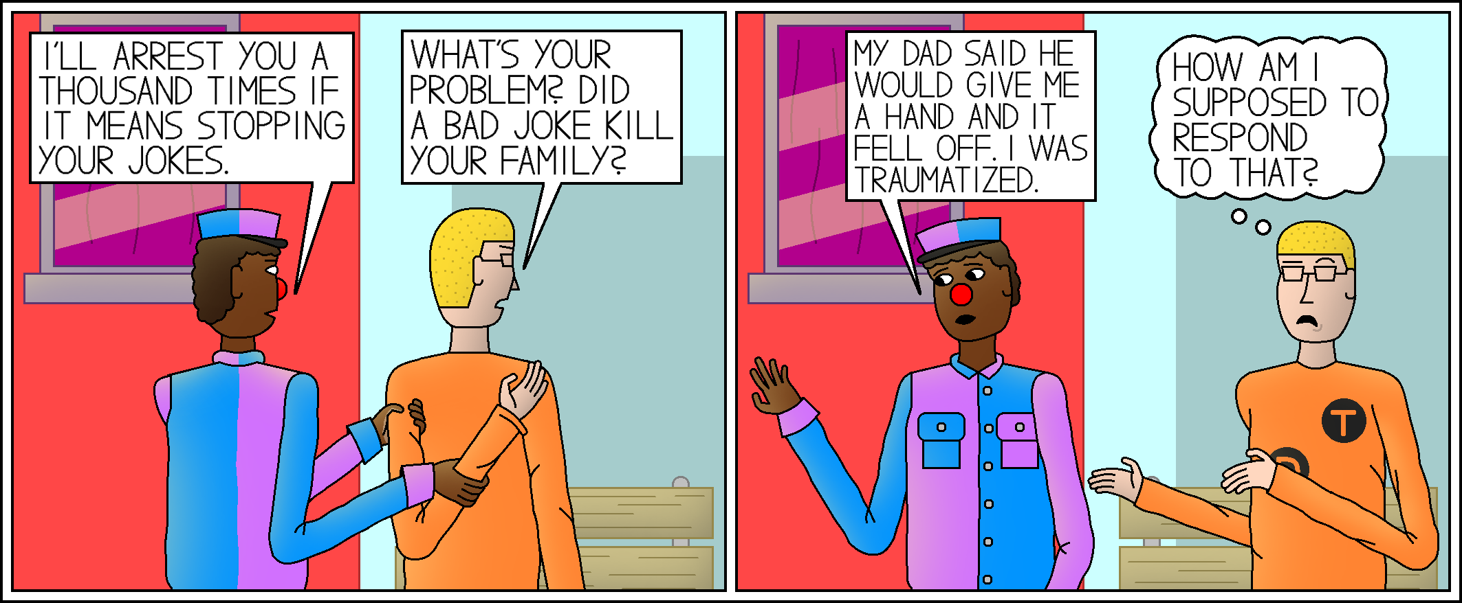Comic 113: No Rest from Arresting November 2, 2020 I know about the rule, “Show, don’t tell,” but I think most of you are glad I didn’t show the traumatic event.