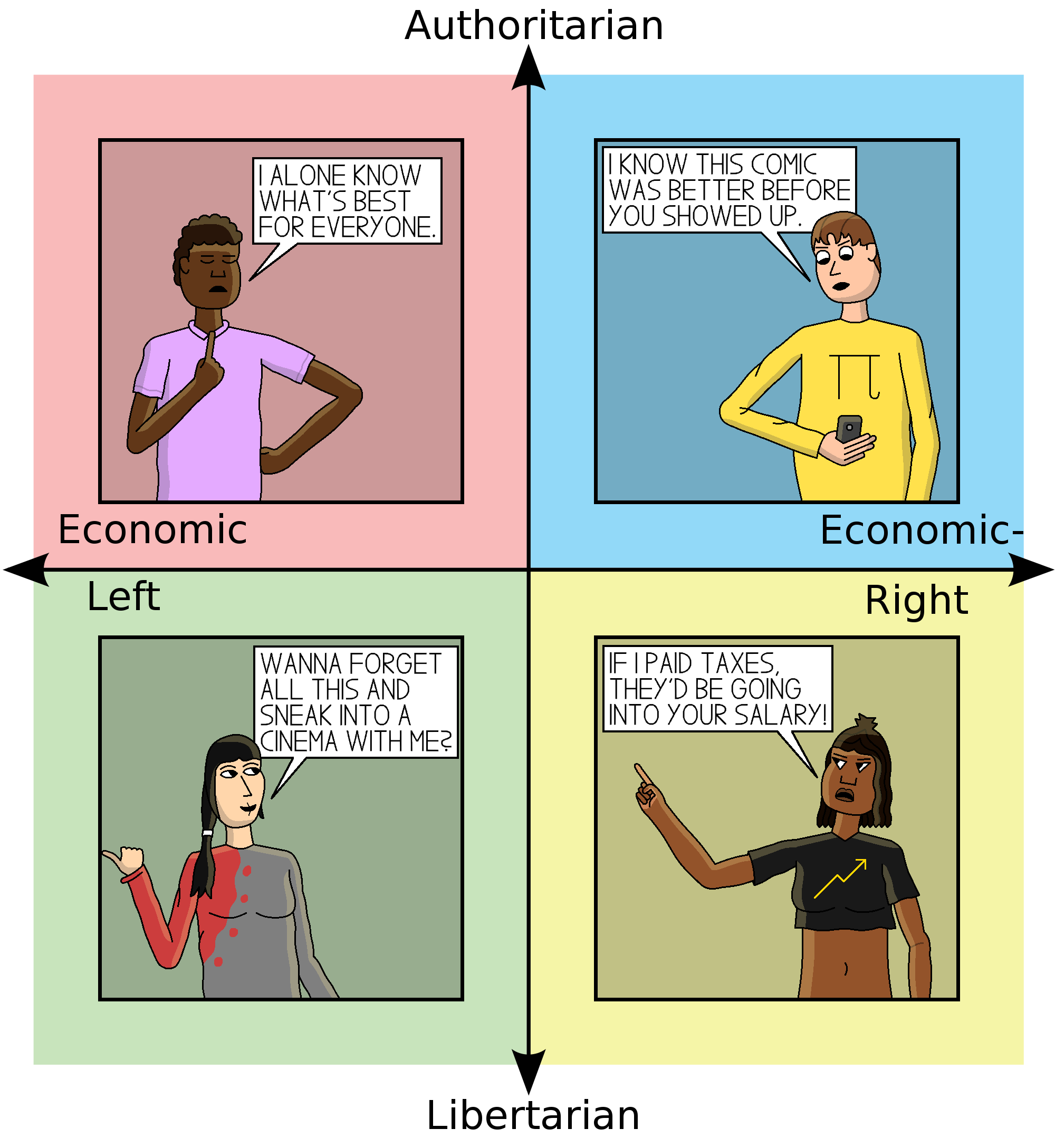 Last year, I stitched together panels from pre-existing comics into a political compass, just for fun. One of the comments asked, “What about other characters?” I think I preached about politics enough to put four of them on it.