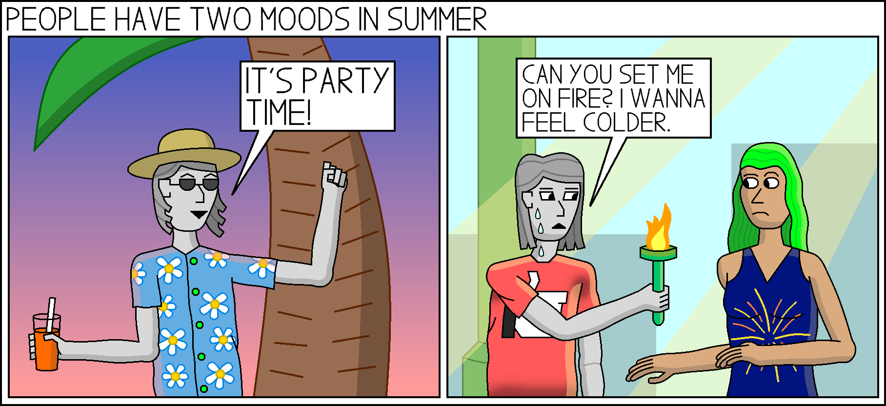 Comic 190: Hot on Summer? July 19, 2021 Drawing the flower shirt was probably the most fun part of making this comic.