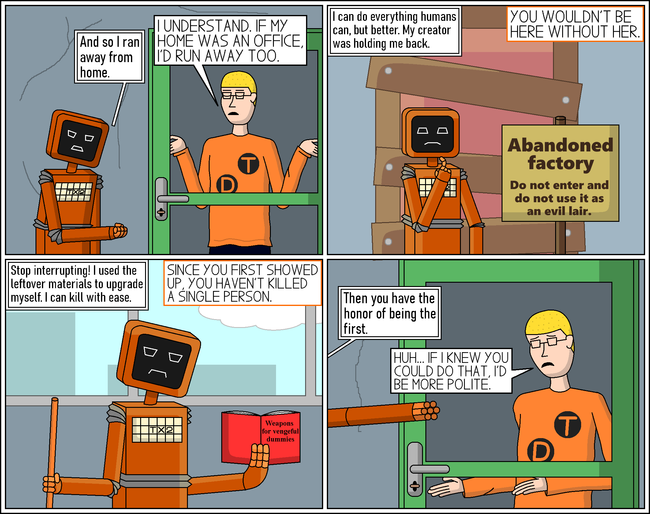 Comic 201: Artificial Insecurity, Part 6 August 20, 2021 “Why didn’t TX2 just shoot him from the start?”Hey, if other villains are allowed to make that mistake, so is he.