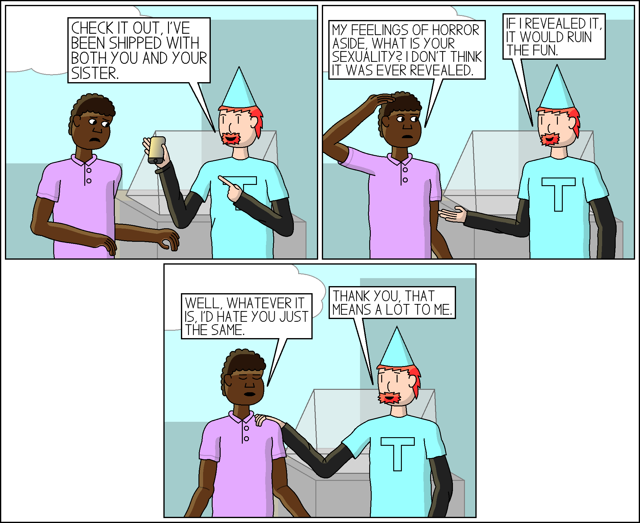 As I’ve said before, I’m not much of a romance guy. A lot of my characters have no confirmed orientation. It makes things easier for the shippers, at least.