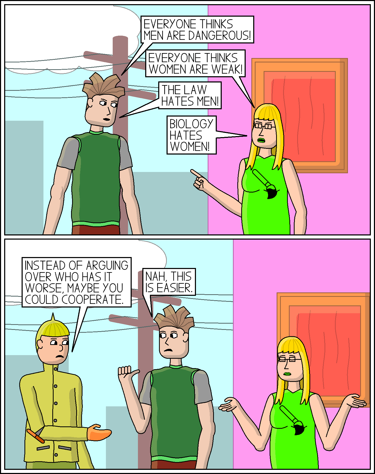 It’s nice to know that discussions about sexism are just as productive in the genderswapped dimension as they are in our own.