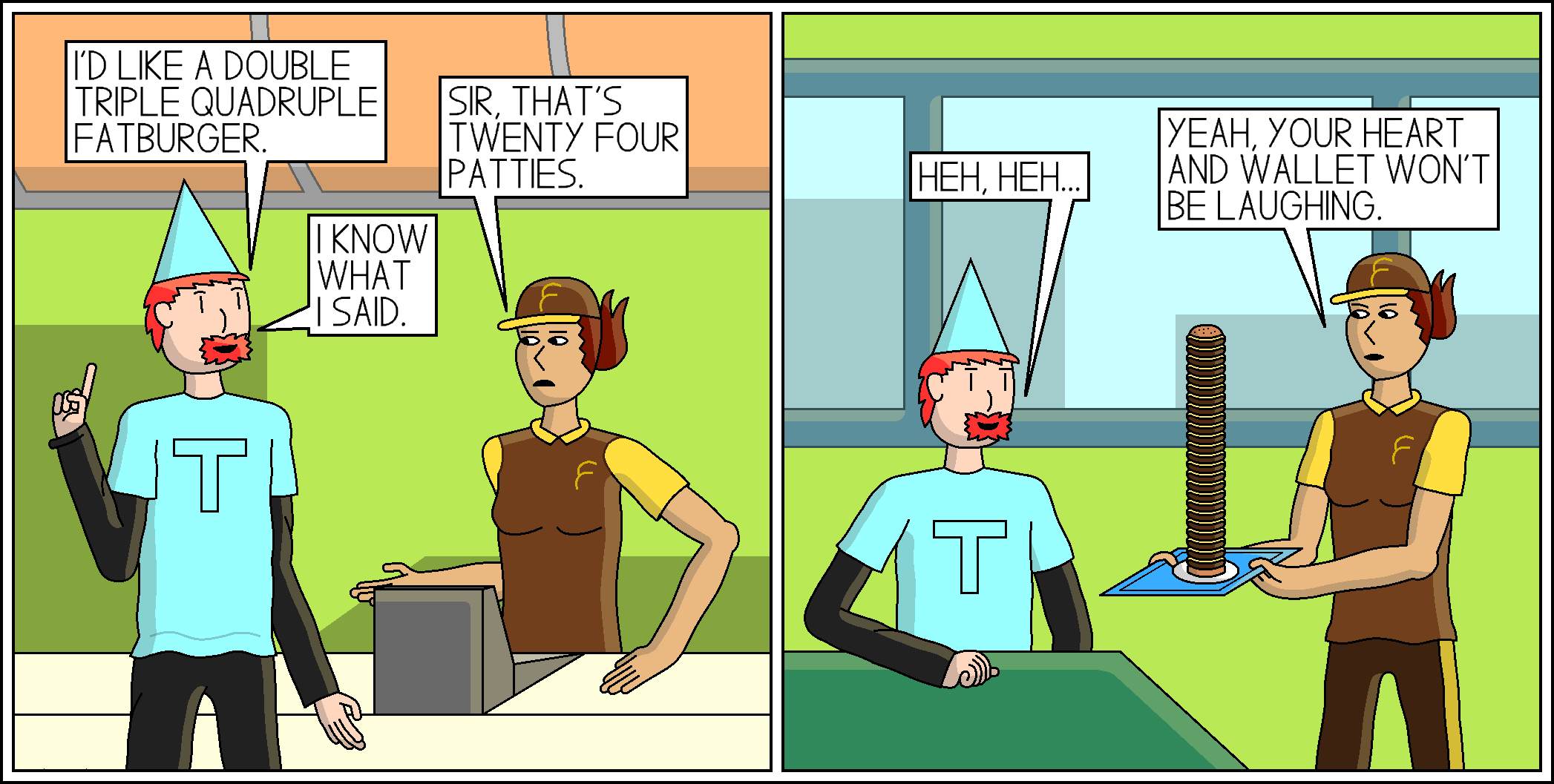 Comic 280: I'm Lovin' It Too Much May 13, 2022 C’mon, Brad Joke, working in a fast food restaurant is hard enough without you.