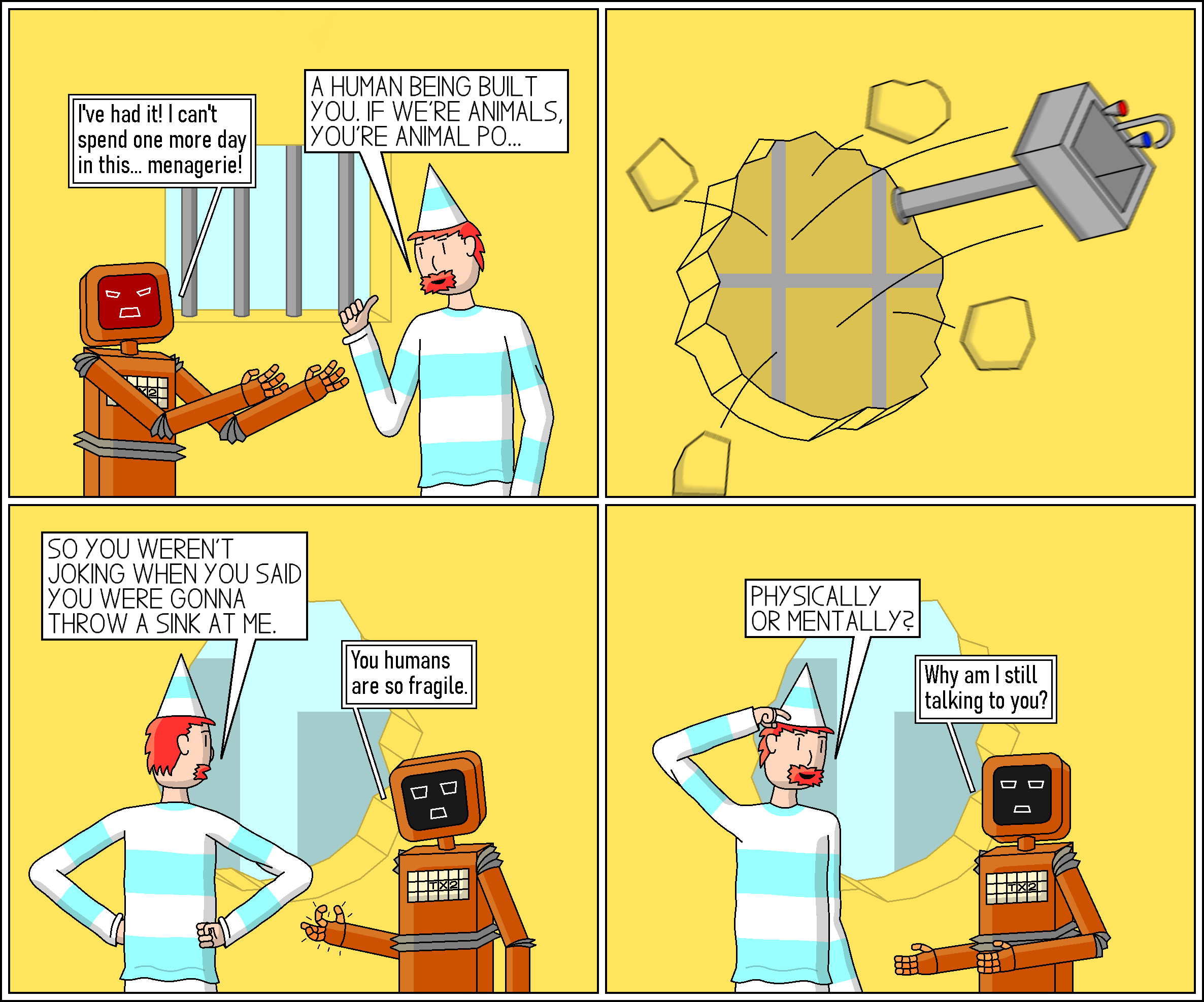 Comic 308: The Missing Piece, Part 5 August 15, 2022 More conversations should end with a sink being thrown through a wall.