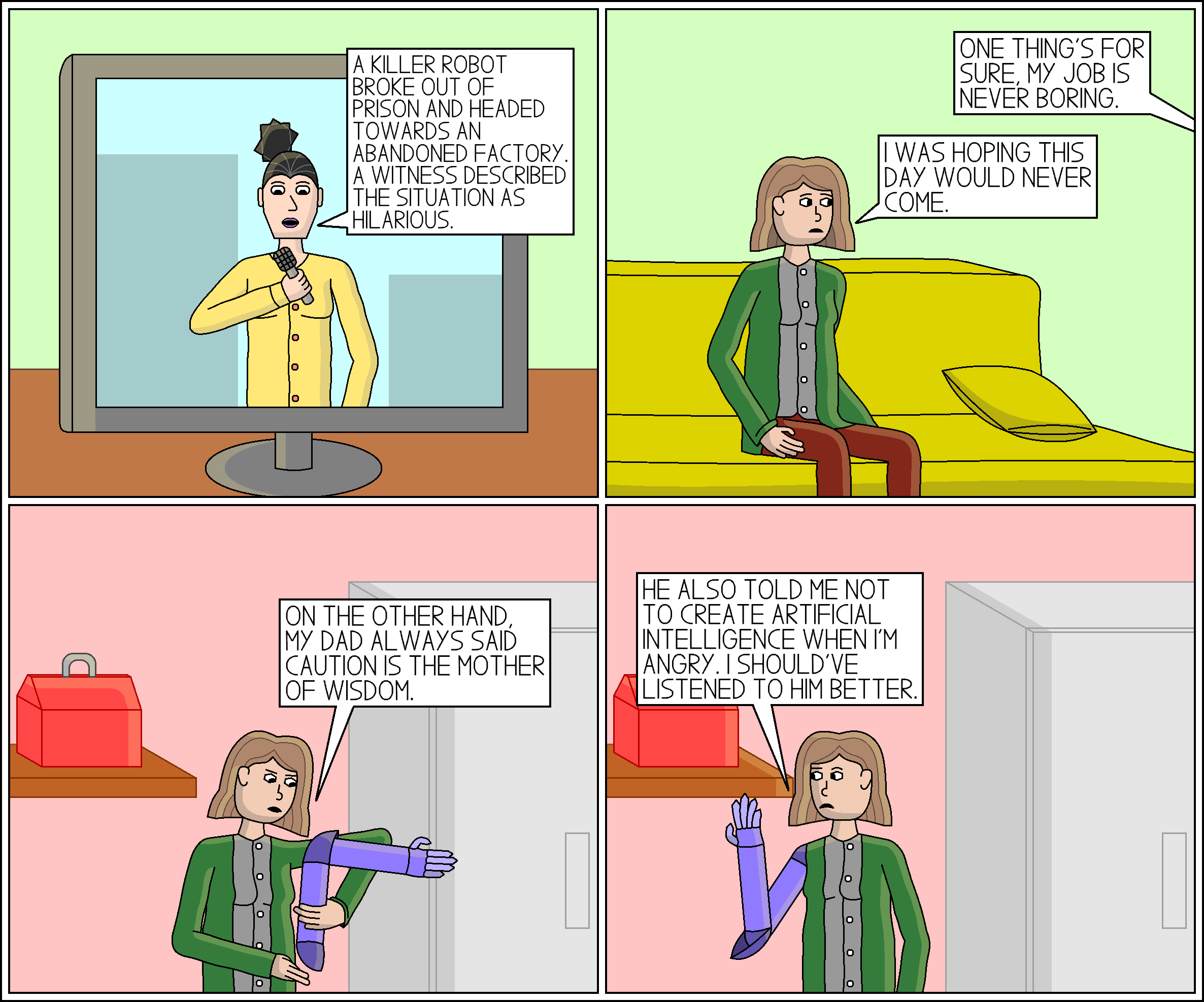 Comic 309: The Missing Piece, Part 6 August 17, 2022 Listen, every home should have a first aid kit, a smoke detector and a robot arm. You never know.