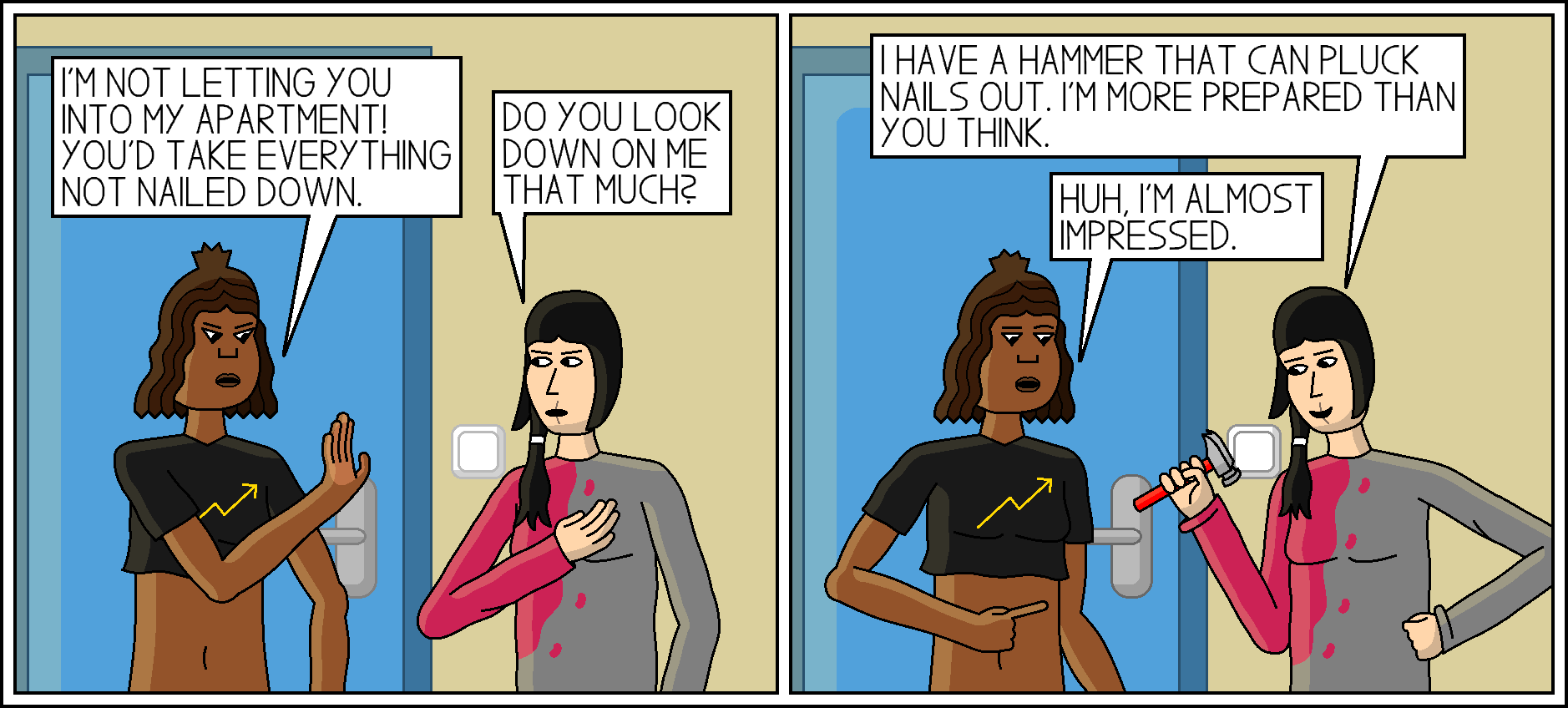 Comic 315: When All You Have Is a Hammer... September 2, 2022 Yeah, Anne Cap nails her possessions down. Something she uses screws, though.The point is, keep your hands to yourself!
