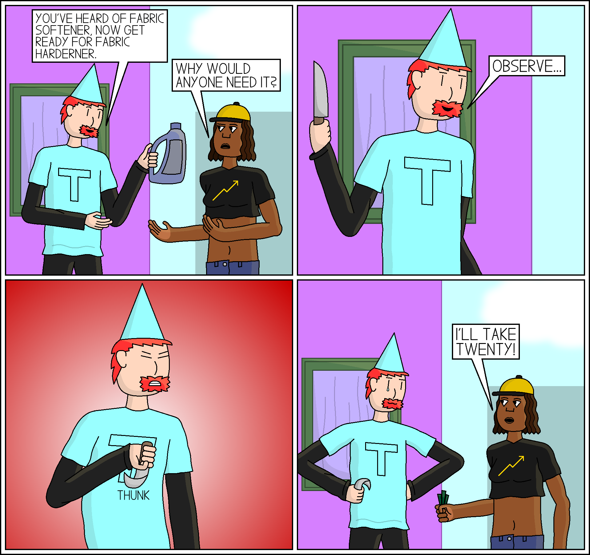 Warning: don’t stab yourself in order to prove how durable your clothes are.