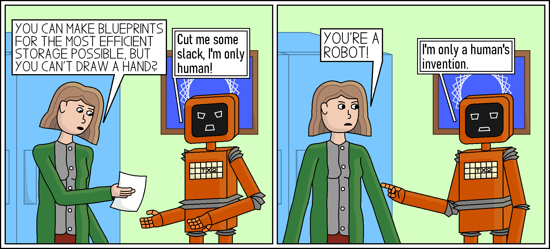 Comic 369: No Perfect Machines March 10, 2023 AI draws malformed hands, but it can draw breasts perfectly. I wonder why…