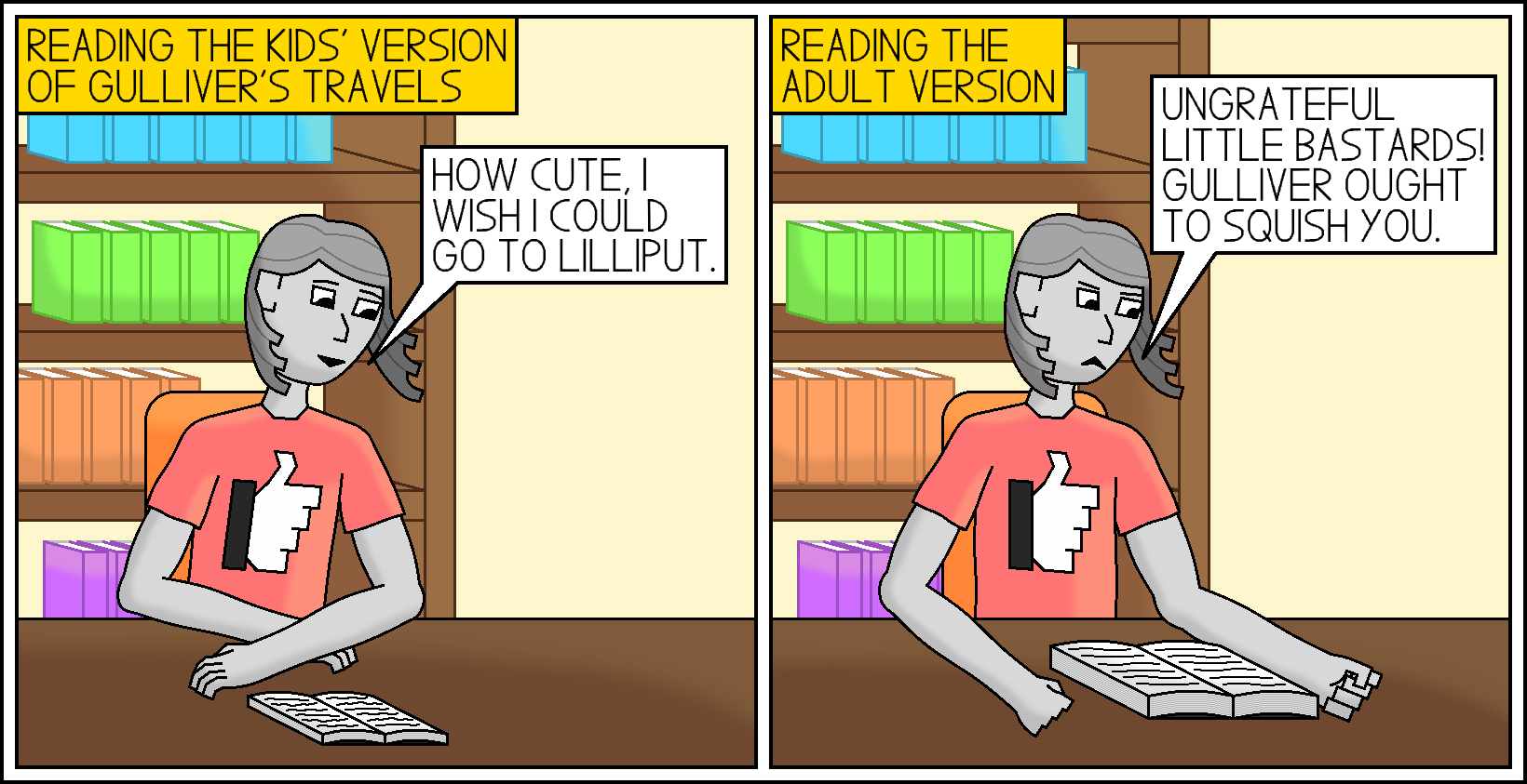 I had to read the adult version in college. The higher ups of Lilliput decided to kill Gulliver because he was eating too much of their food.