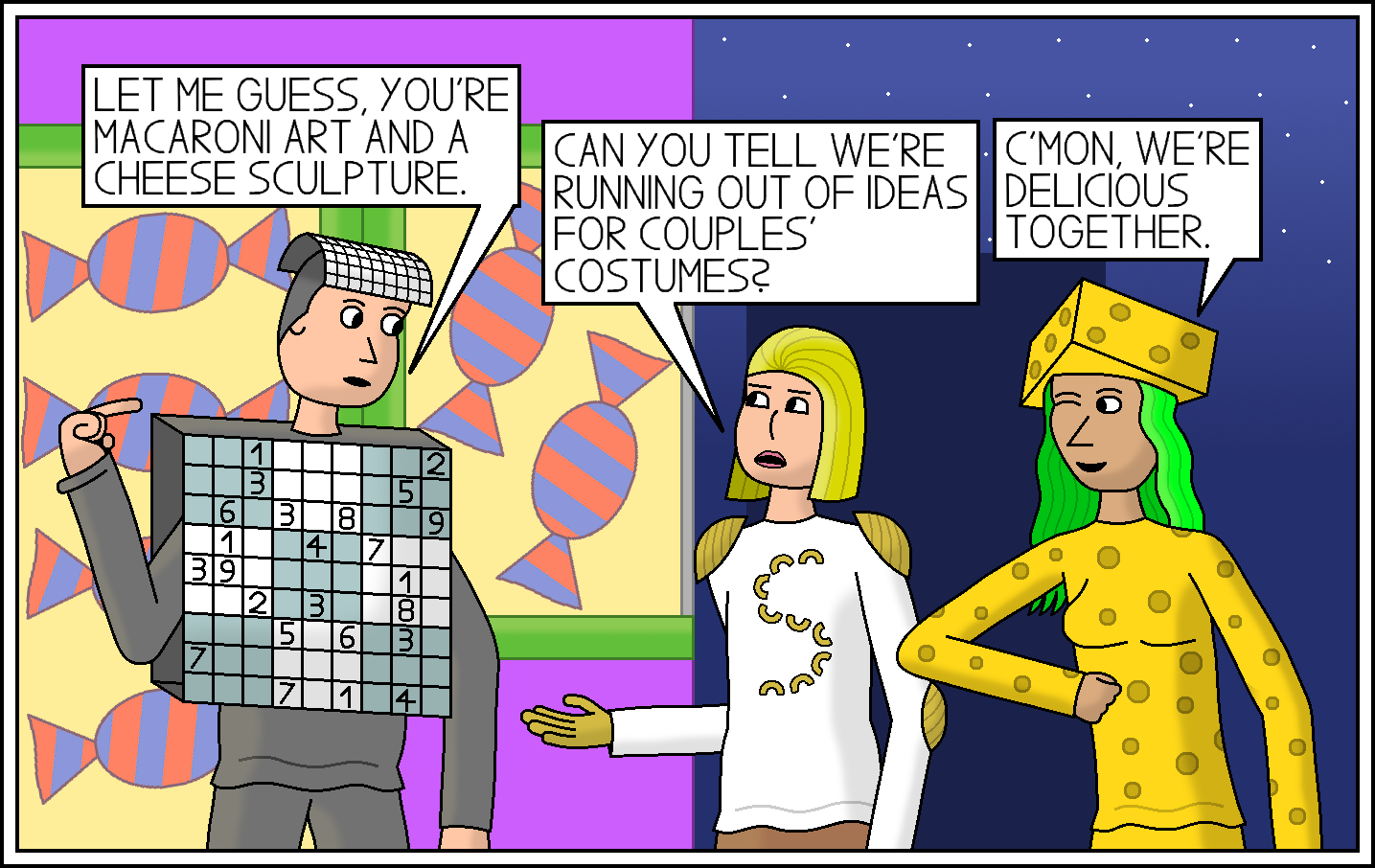 Pi Brain’s costume is based on a sudoku puzzle I was working on the day before. I couldn’t solve it. Here’s your chance to prove you’re smarter than me.