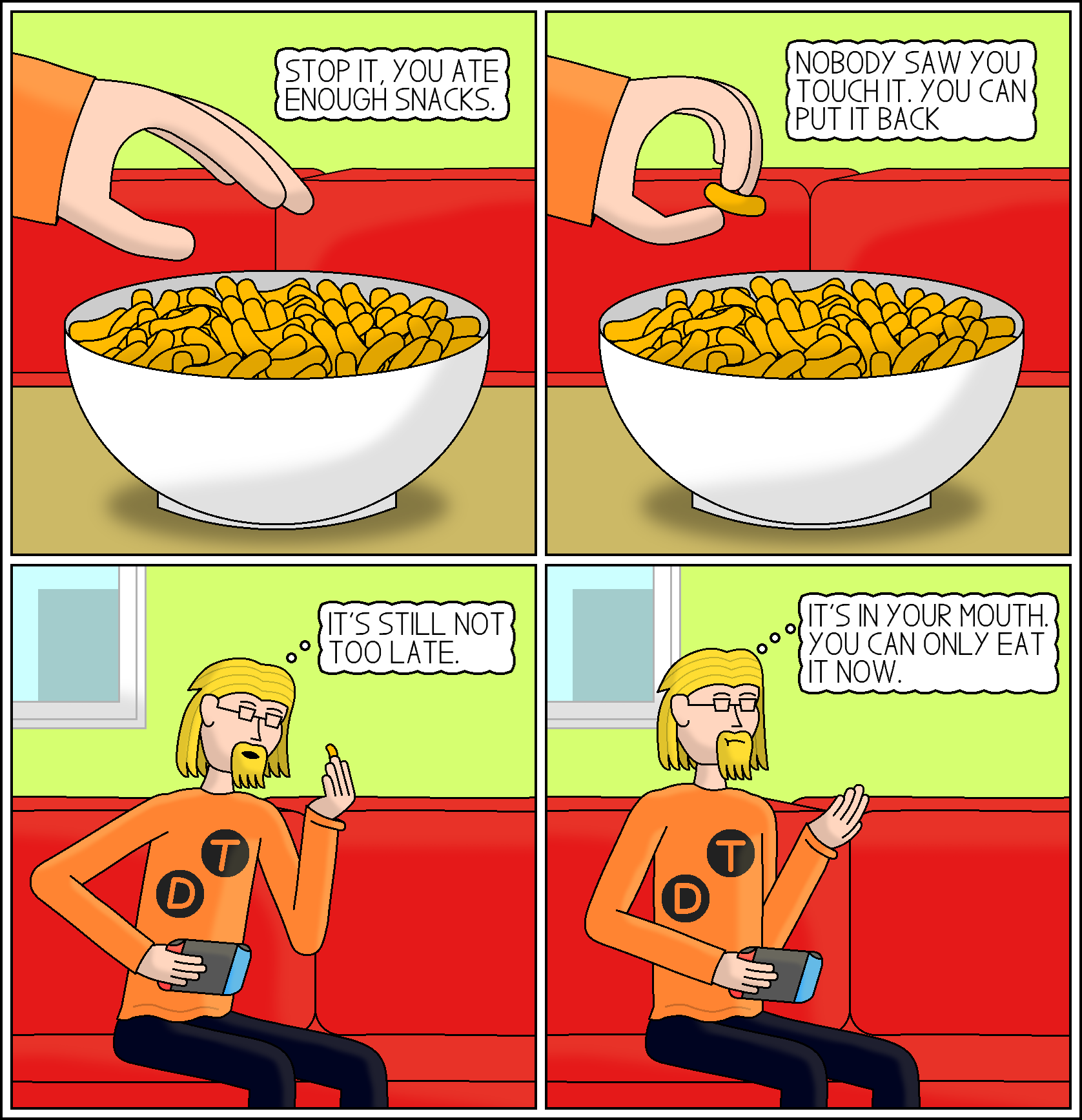Comic 550: Inert Inner Voice October 15, 2024 If you want to eat less food, put it where you can’t see it.Don’t ask me if I do that myself.