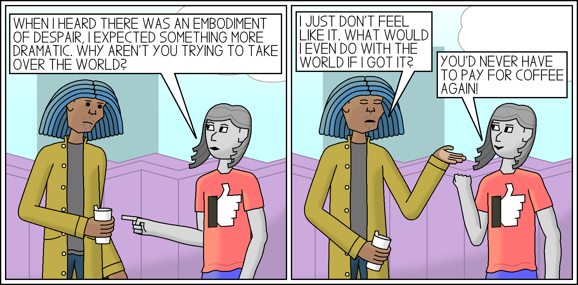Despair’s own despair prevents him from being a threat; he just doesn’t have the ambition or drive to be a villain. Also, being friends with Hope certainly doesn’t help.