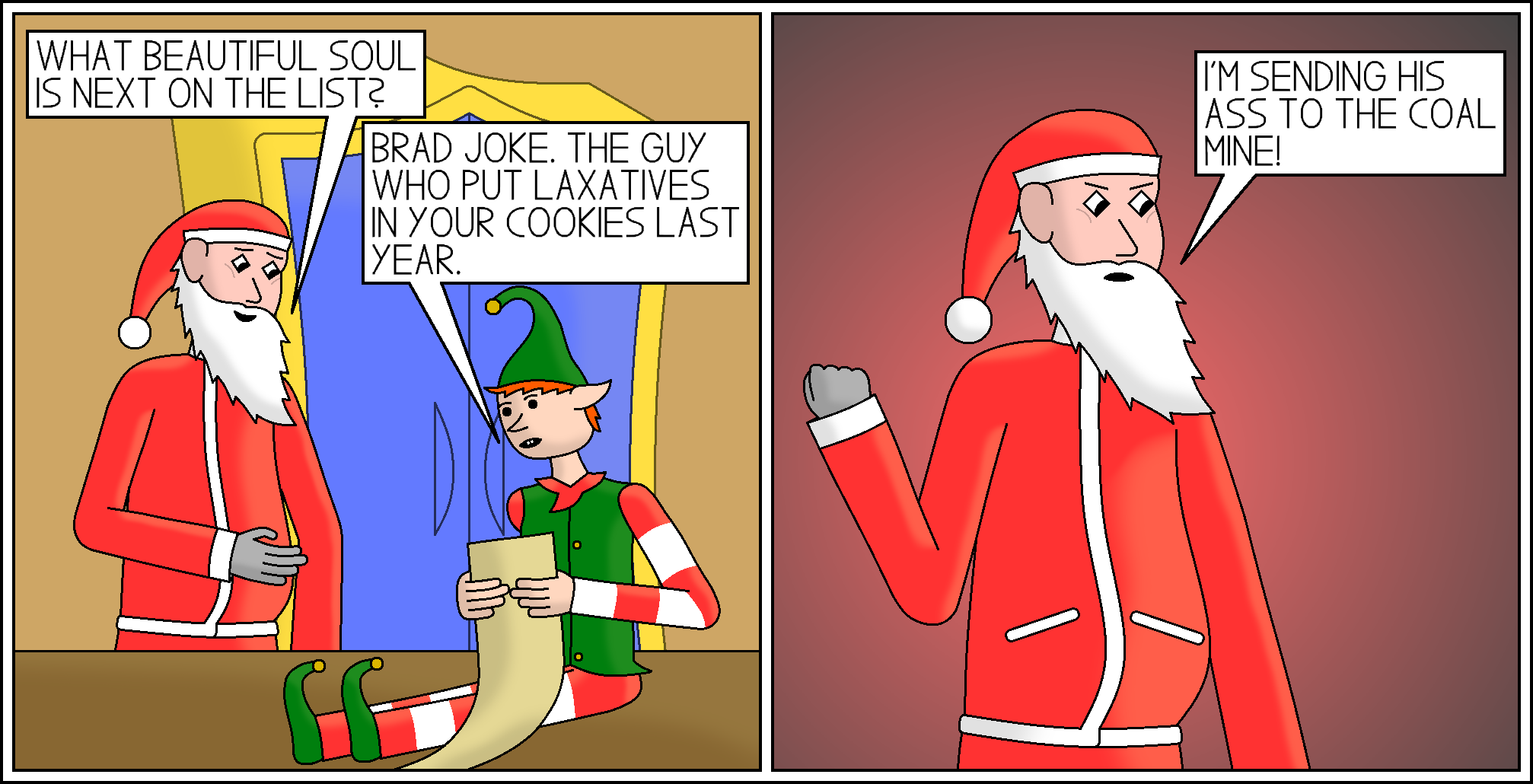 Comic 557: Super Naughty List November 10, 2024 C’mon, Santa. Brad Joke was just trying to make sure you’re not clogged up.