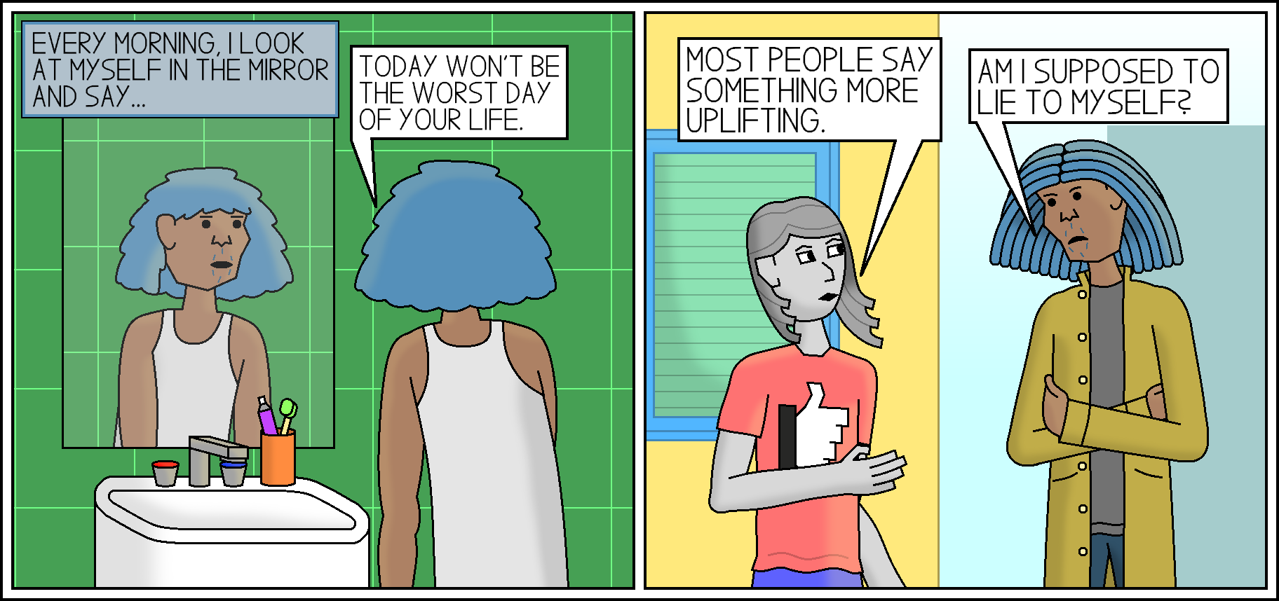 Comic 608: The Mirror Never Lies June 20, 2025 Maybe that’s why people say, “Fake it till you make it.”
