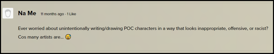 I got this questions a few times during my QnAs and it was never one of the first ten or first twenty, so I never answered it. Admittedly, it’s not the easiest topic to talk about, but since so many of you are curious, my answer is: kind of. Obviously, I don’t want to promote racism, but I also don’t want to walk on eggshells. Minorities are not made of glass and they shouldn’t be treated as such. Be kind, but don’t be condescending.