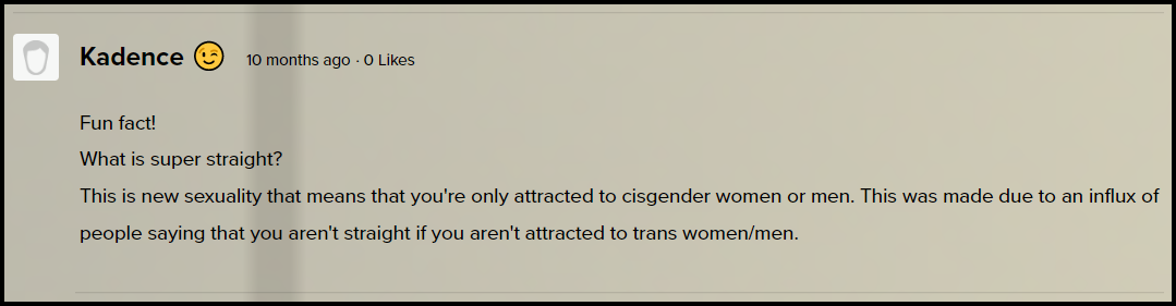 Remember when "superstraight” was a thing? I still don’t know what to make of it. I didn’t think it was inherently offensive (not being attracted to someone is not the same as discriminating against them), but I didn’t think it was necessary either. It sounds more like a preference than a sexuality.
