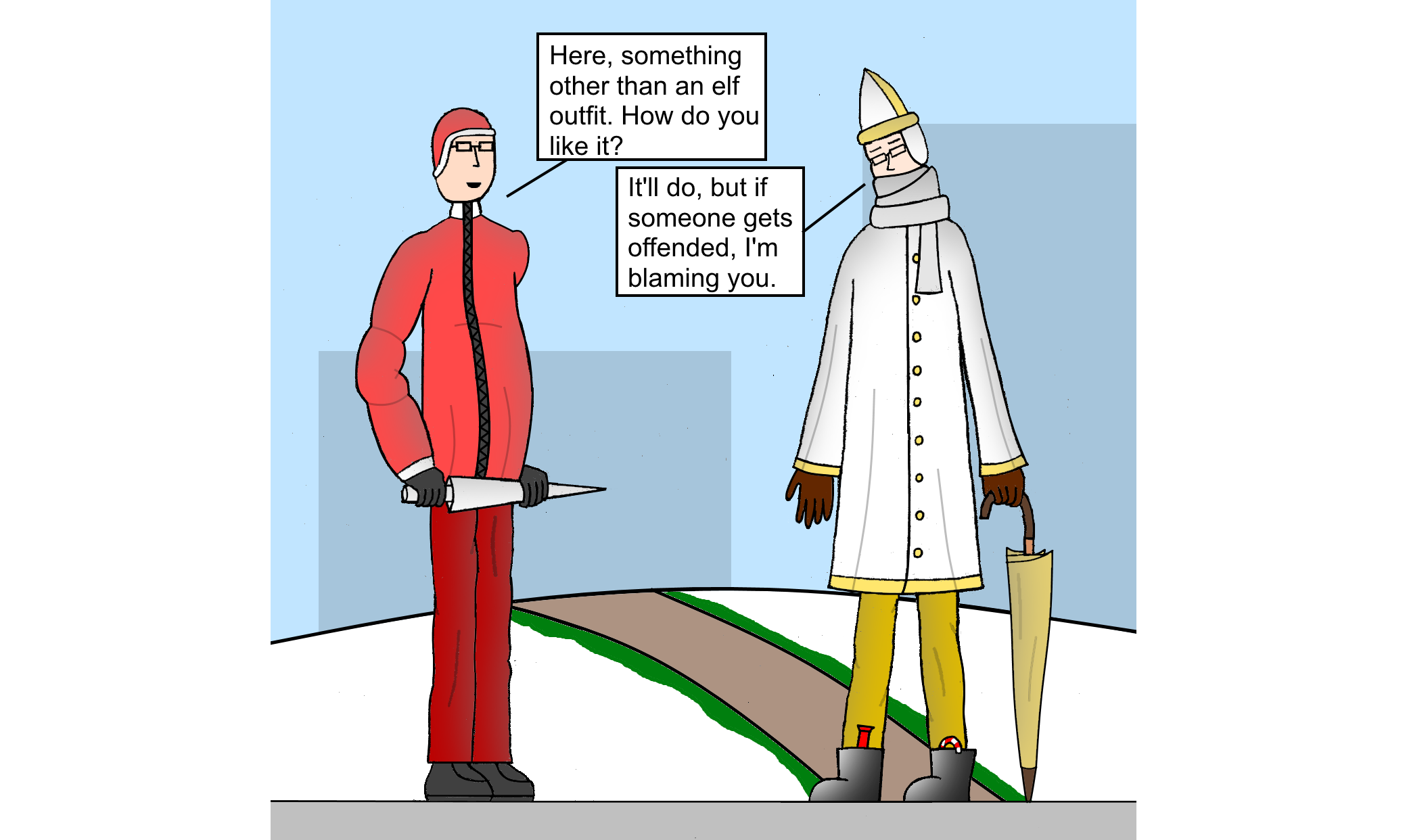 Last year, I got an idea for another comic that required Double Tap to dress up for winter. I thought the Saint Nicholas outfit was too on the nose, so I decided to change it again. This time I used the Ice Climbers as an inspiration. I hope you know that game: