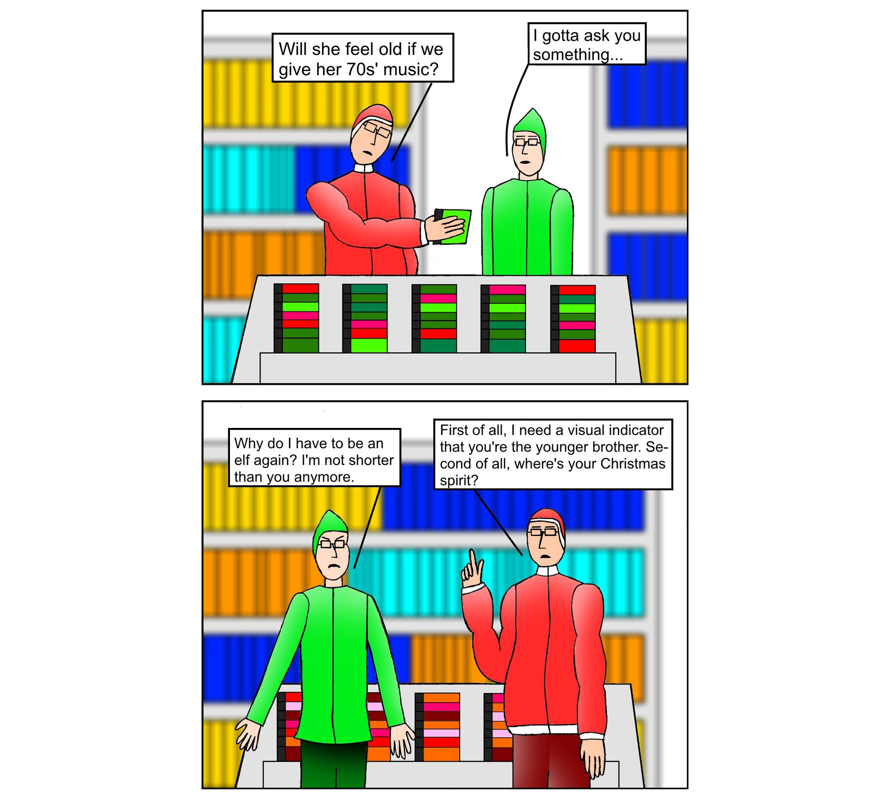 Christmas is coming soon, which means it’s time for me to draw Christmas comics. I figured it’s a good time to talk about the winter outfits I gave to Double Tap, the comic version of my brother. A few years before I started my website, I thought it would be funny if my outfit resembled Santa and his resembled an elf: