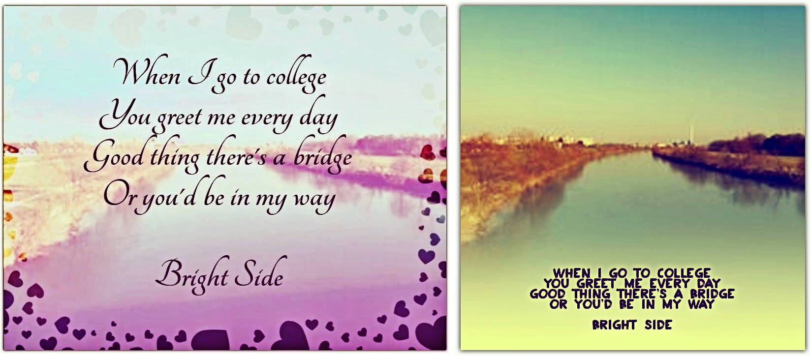 Created by Lila and Azariah. They both posted their pictures on share.pho.to. I hastily wrote a poem about the river that goes through my city and the two of them decided to place it on top of the photo I took. I had no idea it would be such an inspiration. Maybe I could take more photos; you guys seem to like modifying them.