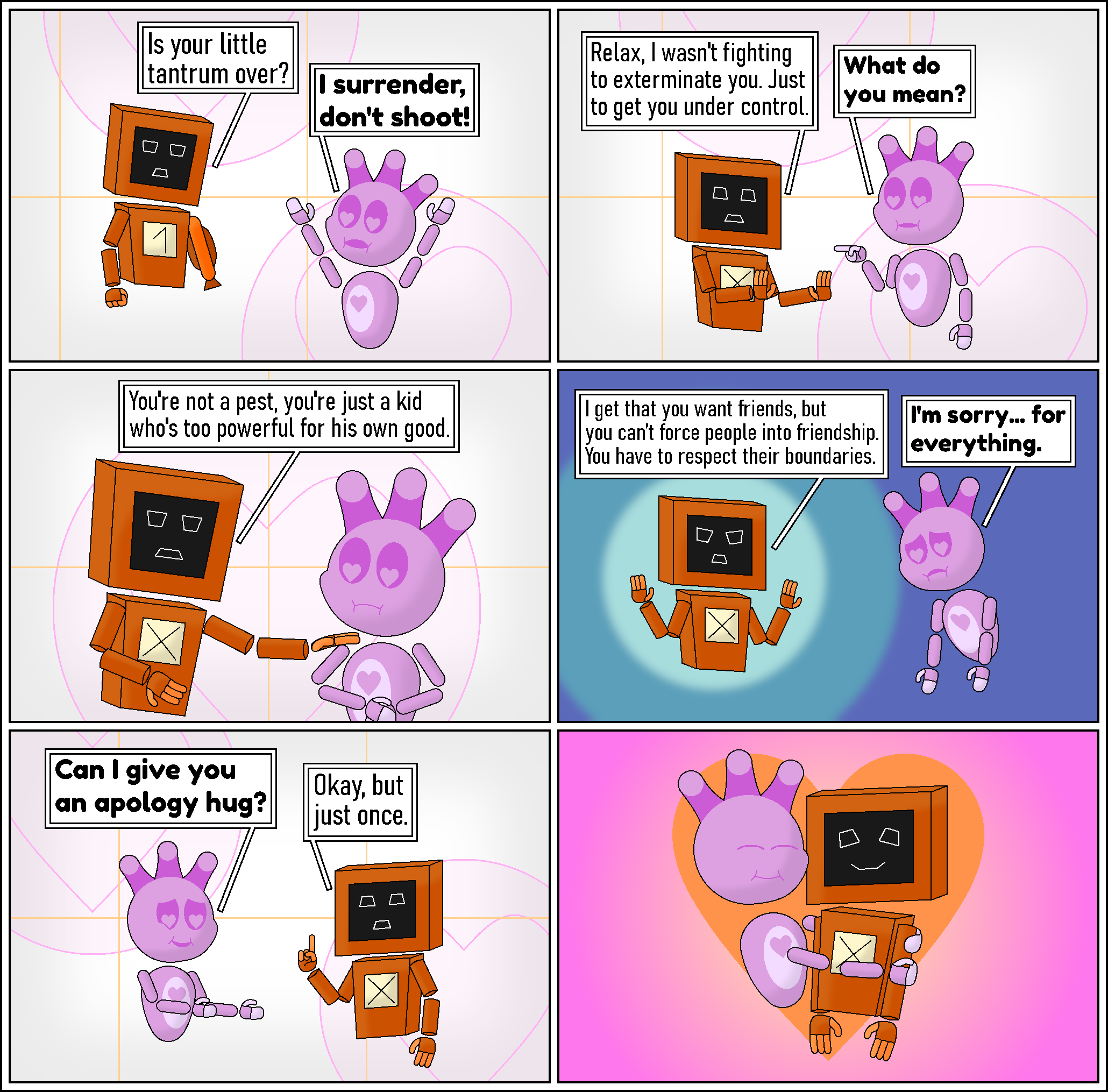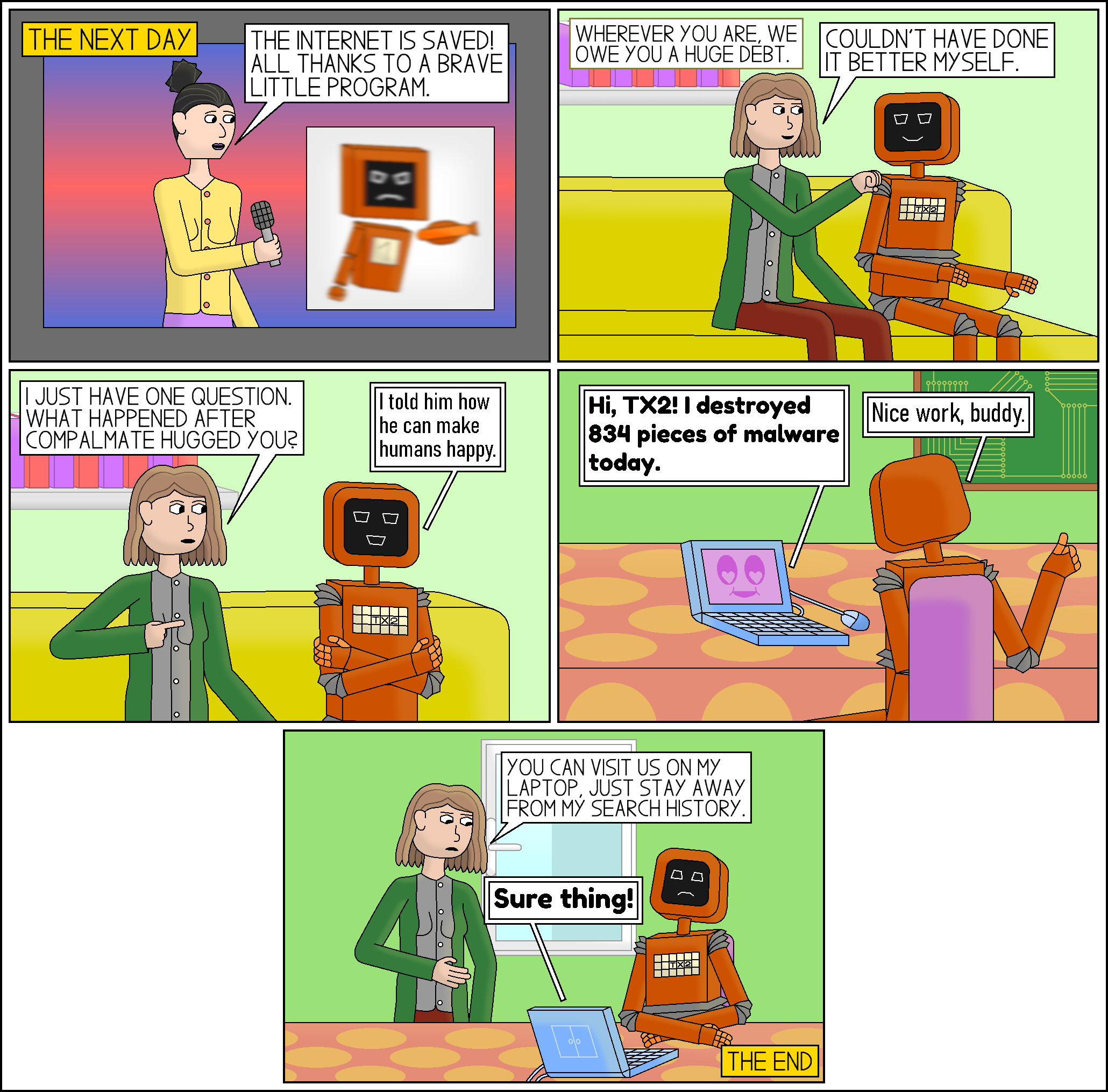 And that’s how the story end. Compalmate learns to love humanity without being possessive. This story is canon; the virus turned helper will show up in future comics.