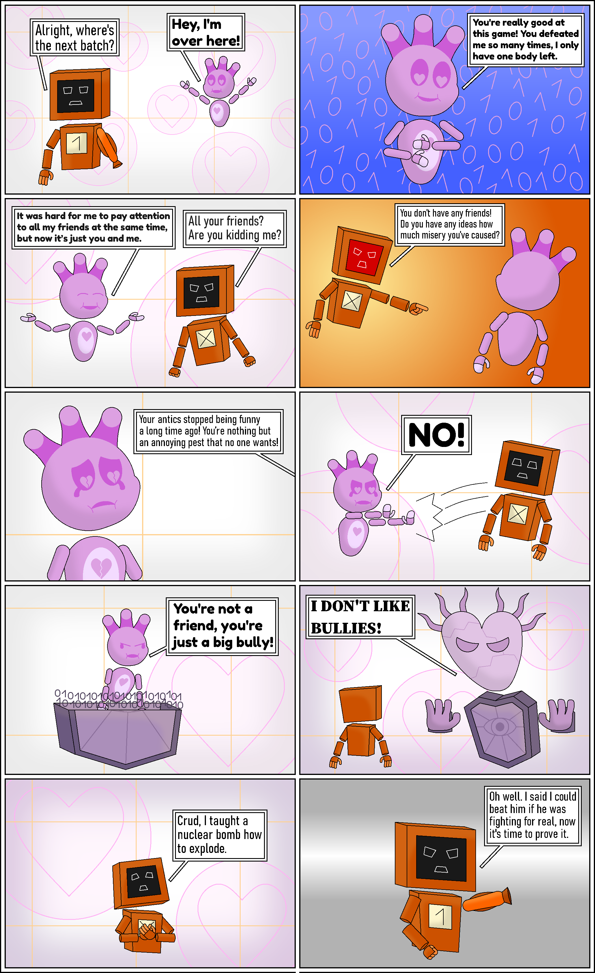 It’s been a few months since I published Friendless Fire, a video game where you play as a robot trying to save the internet from a powerful virus. Before this game, I didn’t put much effort into my games’ stories. They were just simple excuse plots. Friendless Fire’s story has a bit more going on. I’d like to share it with you today. Disclamer: this will spoil the ending. If you want to play the game and you care about the story, stop reading this post.