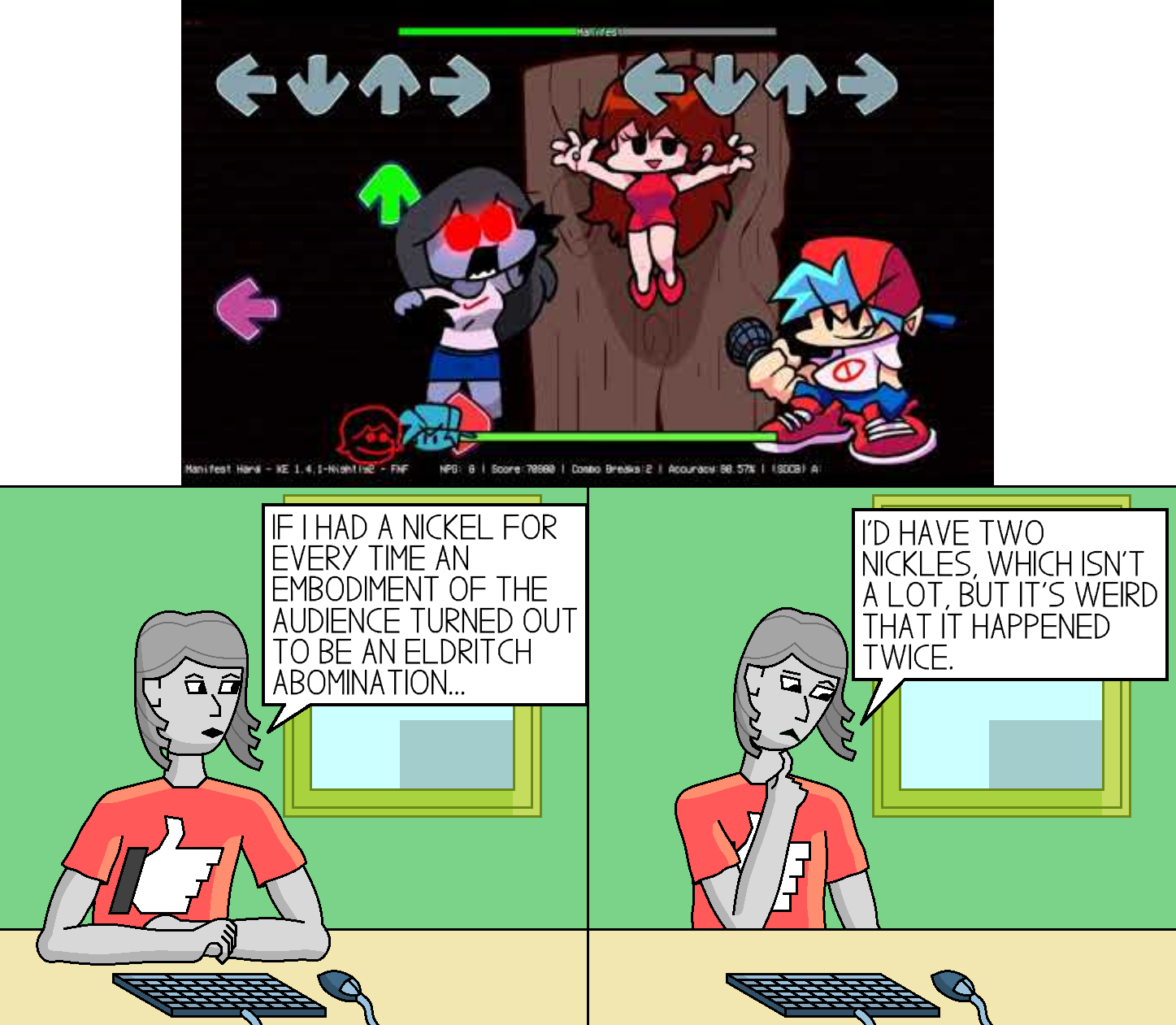 First I discovered the SCP 001 proposal: The Sky above the Port; it’s about a monster that has to be shown SCP articles or reality will be destroyed. Then I came across a Friday Night Funkin’ mod where a fangirl named Sky drags the protagonist into an alternate dimension with the goal of getting together with him. Gee, I wonder who that’s a parody of…
