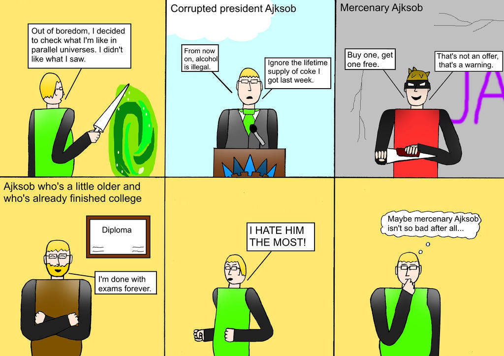 The panel that aged the worst is probably the fourth one. I didn’t give my self-insert a beard or a brown shirt. My logic was, trees start out as completely green, but then they turn brown. Furthermore, I was not done with exams forever when I finished college. As you might know, I had no luck finding a job, so I started an accounting course. Obviously, there was an exam at the end. I’m happy to say that I passed on the first try. My CV is a little fuller now and I looking for a job again. Hopefully I won’t have to start another course.