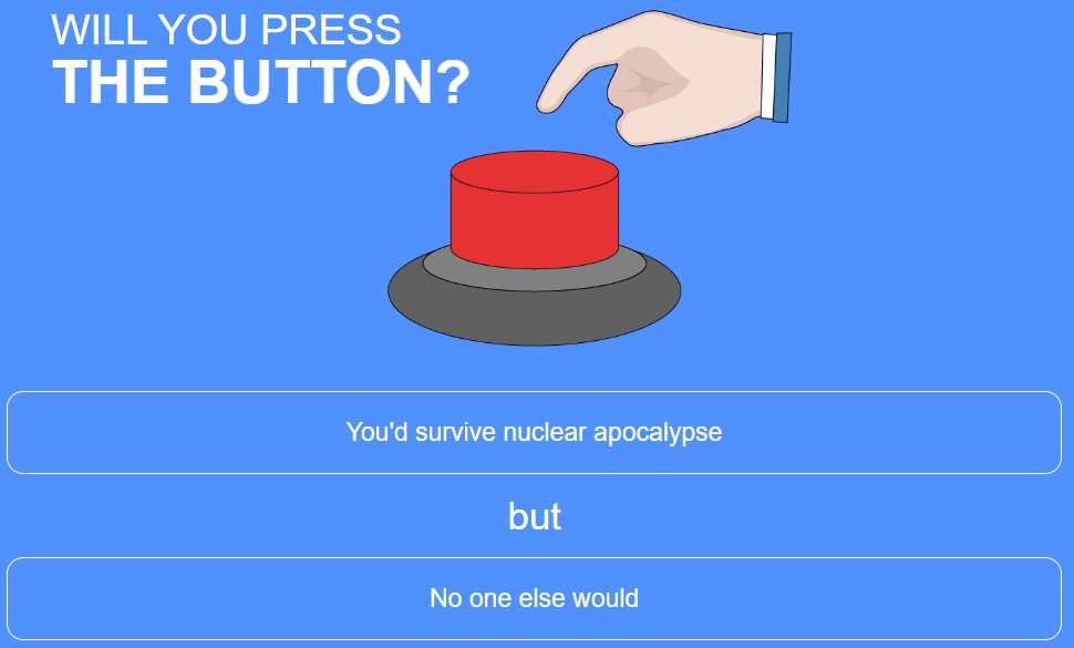 To be honest, I have little to no survival skills. Even if I was a top tier survivalist, living the rest of my life alone in the world sounds like a fate worse than death. Plus, pressing the button means dooming everyone else to certain death. This button is a hard no.