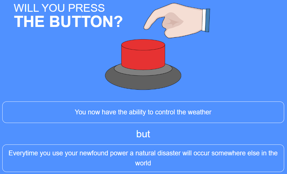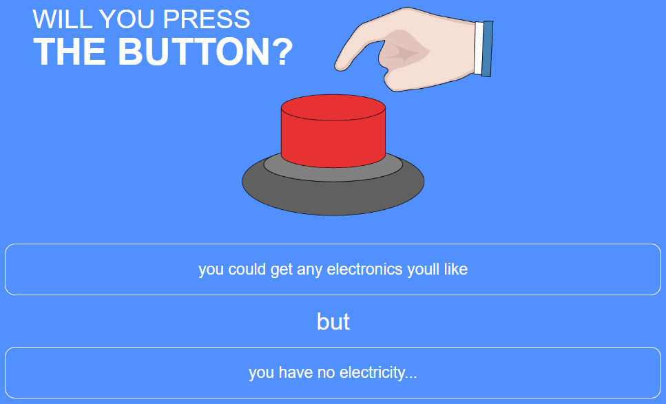 And that’s five of them. I want to end this by making my own hypothetical button. For the rest of your life, you’ll win any competition that you enter, including the rewards. However, everyone knows that a supernatural force made you the winner; you didn’t really earn it. Will you press the button?