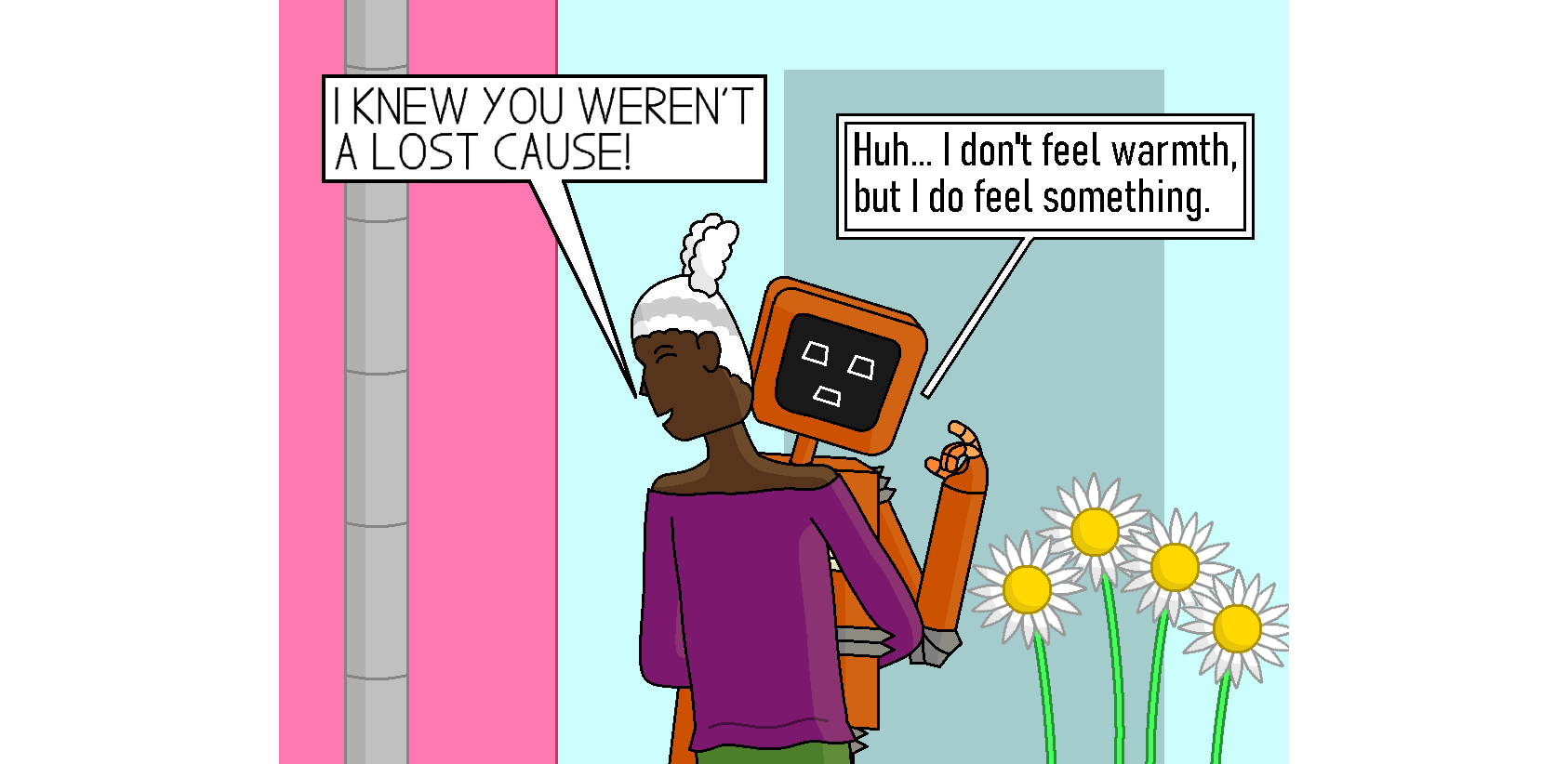 A while ago, I made a comic where TX2 got mocked for his inability to feel the warmth of a hug. I wondered, what would happen if someone did hug him? I decided to draw a short comic about it.