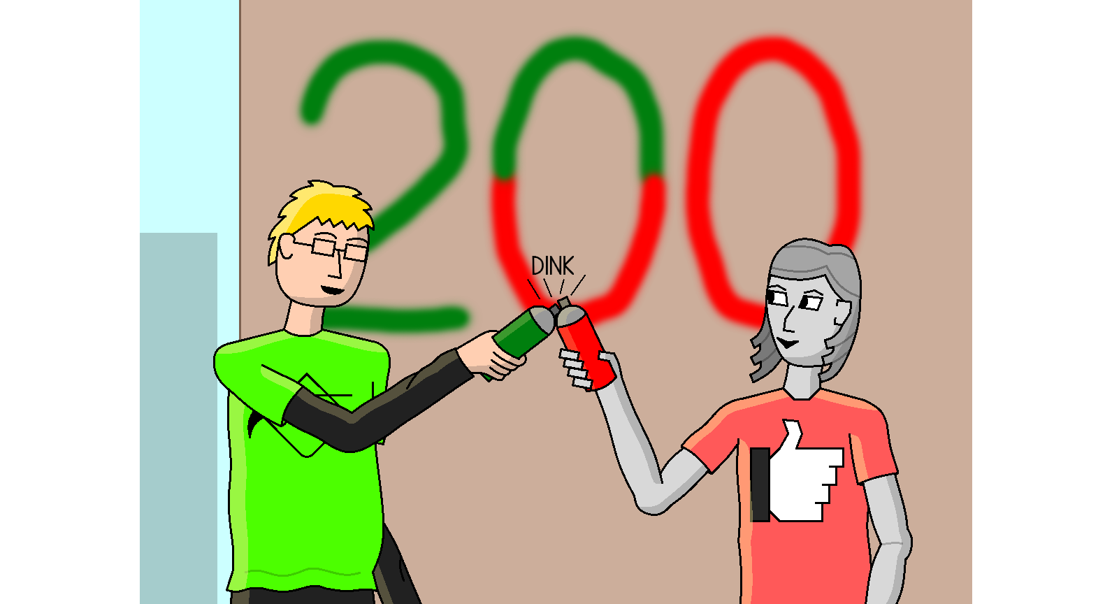 Okay, let’s actually celebrate this achievement. I know I didn’t do anything for the 100th comic, so it’s time to make up for it. What’s a better way than to draw my self-insert and the audience surrogate? That’s a much faster description than the last mouthful I used.