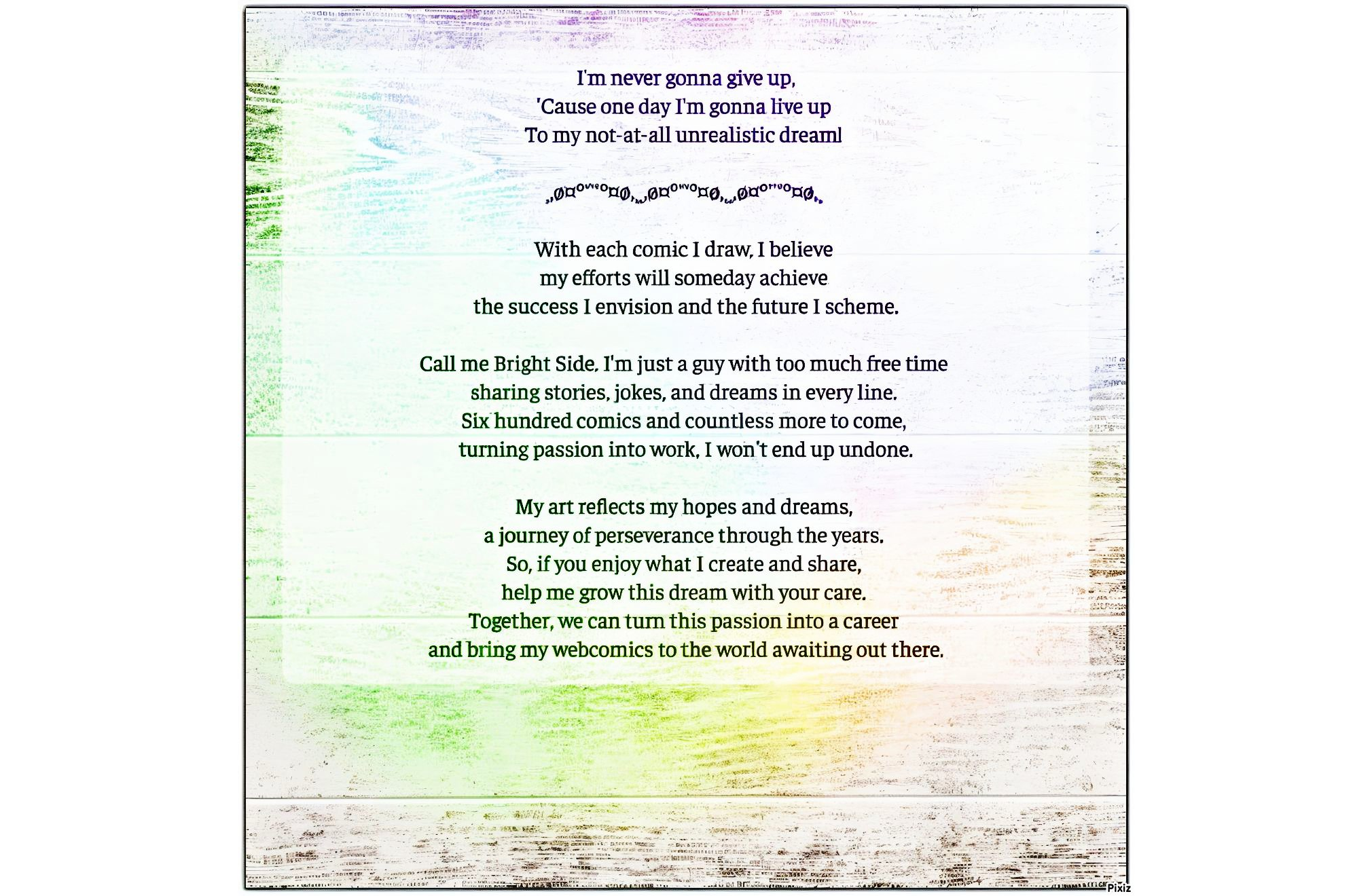 When I posted my 600th comic, one of the comments took a lyric from “I’ve Got a Dream” and modified it to suit me: “I have a dream, and I know one day this comic will reign supreme!” I decided to play along and add a few lyrics of my own. That inspired Fans and Lila to add their own lyrics and make a whole poem. It’s probably the most wholesome instance of snowballing you can find.